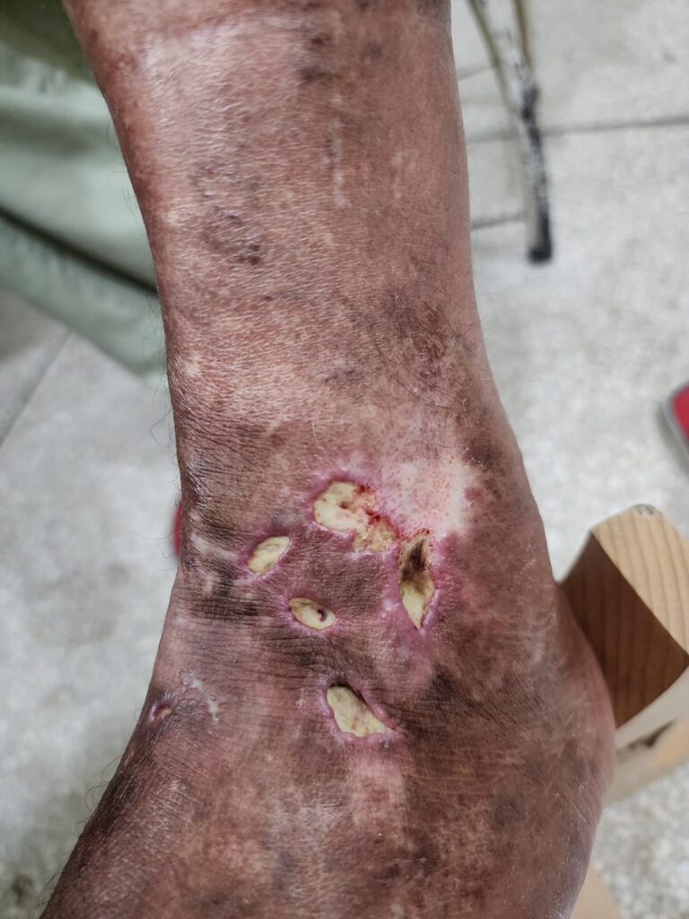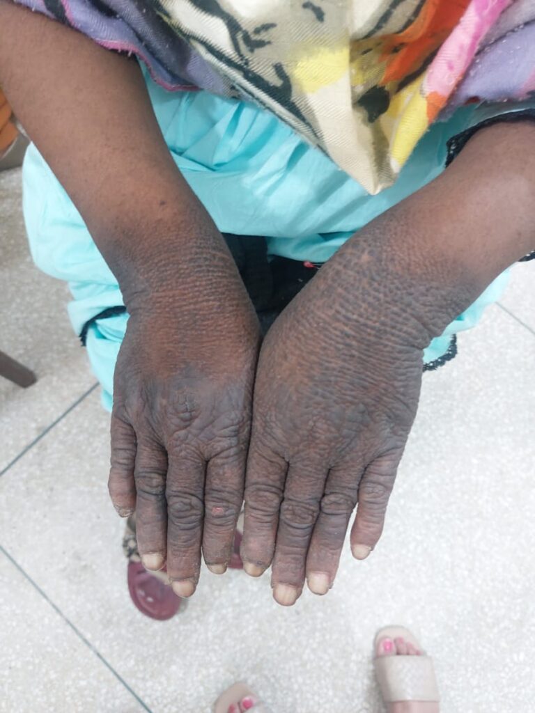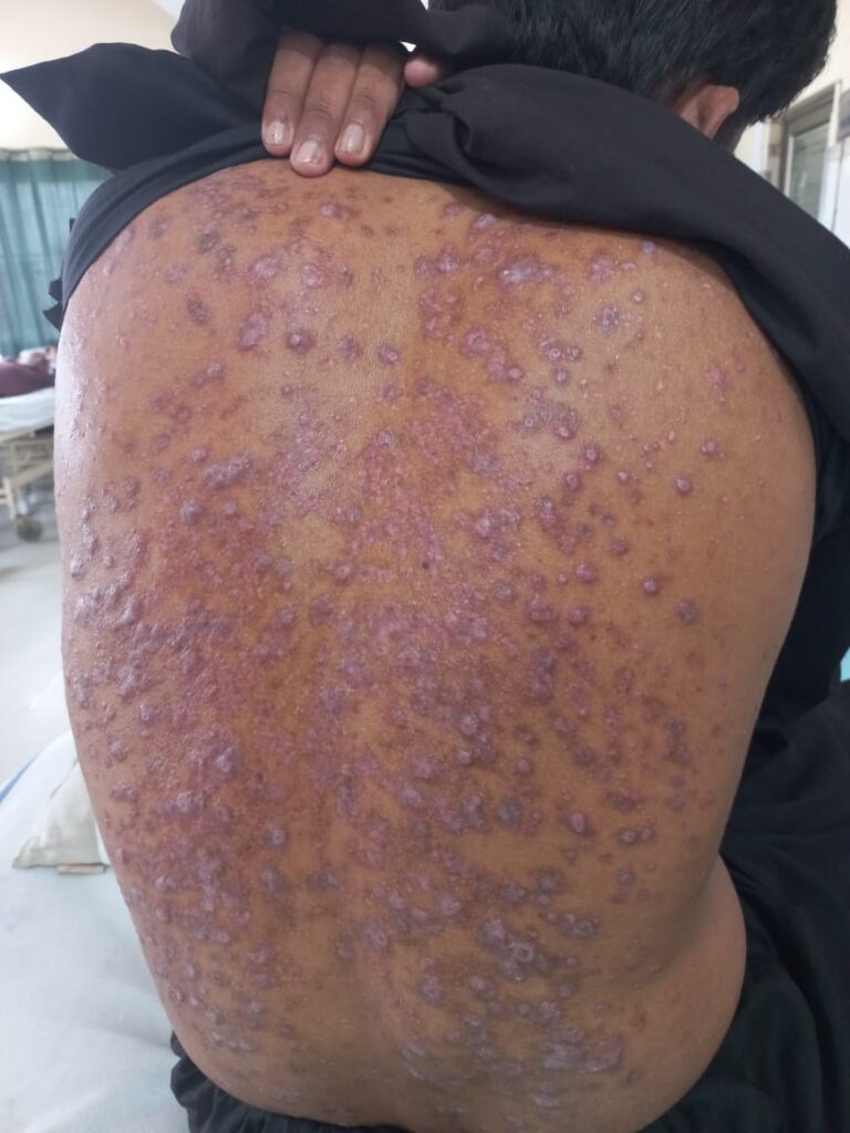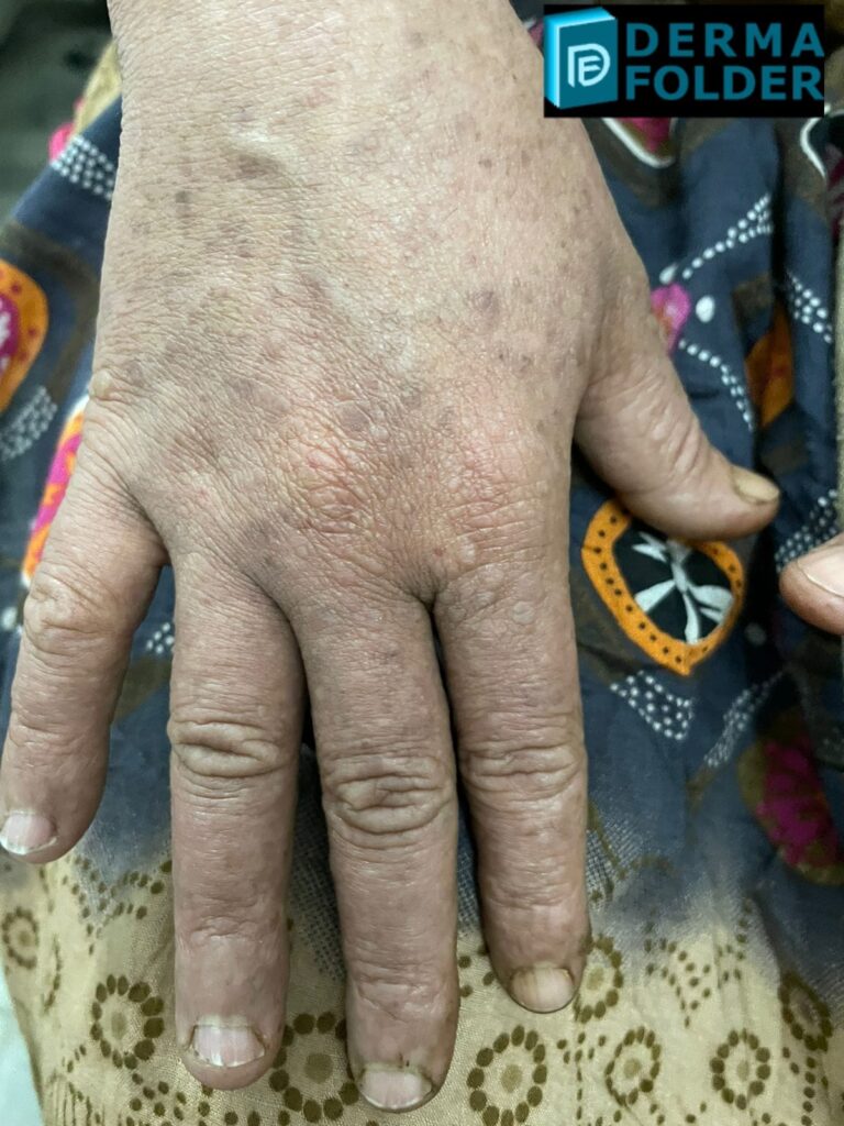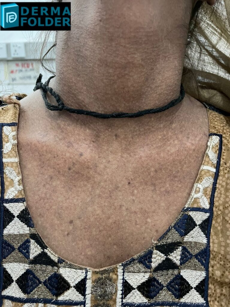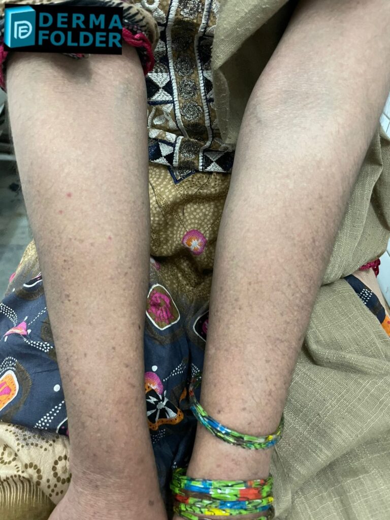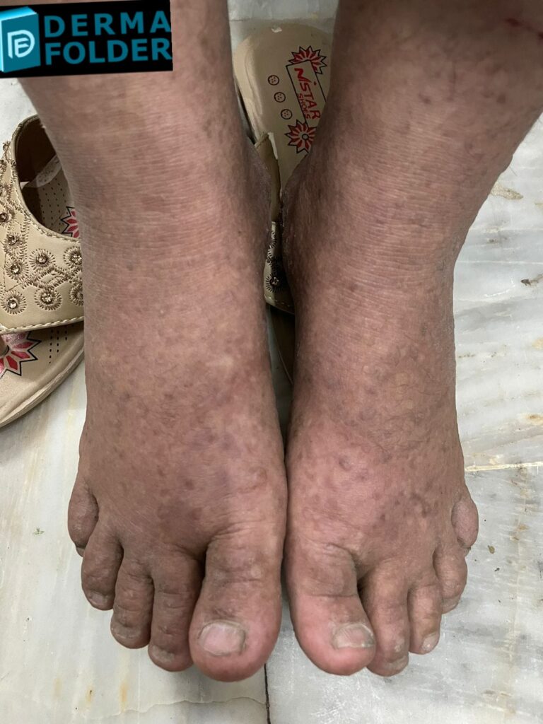 In exam we had a pt with typical lesions of papular amyloidosis on shin bilaterally but she had lesions of macular amyloidosis on her back and shiny nails secondary to chronic pruritis.