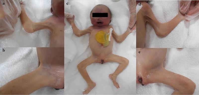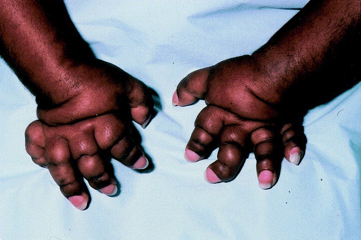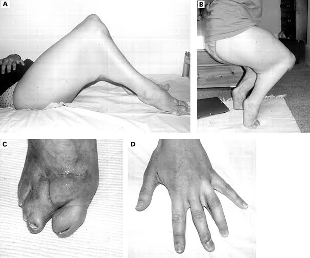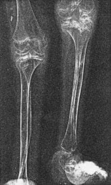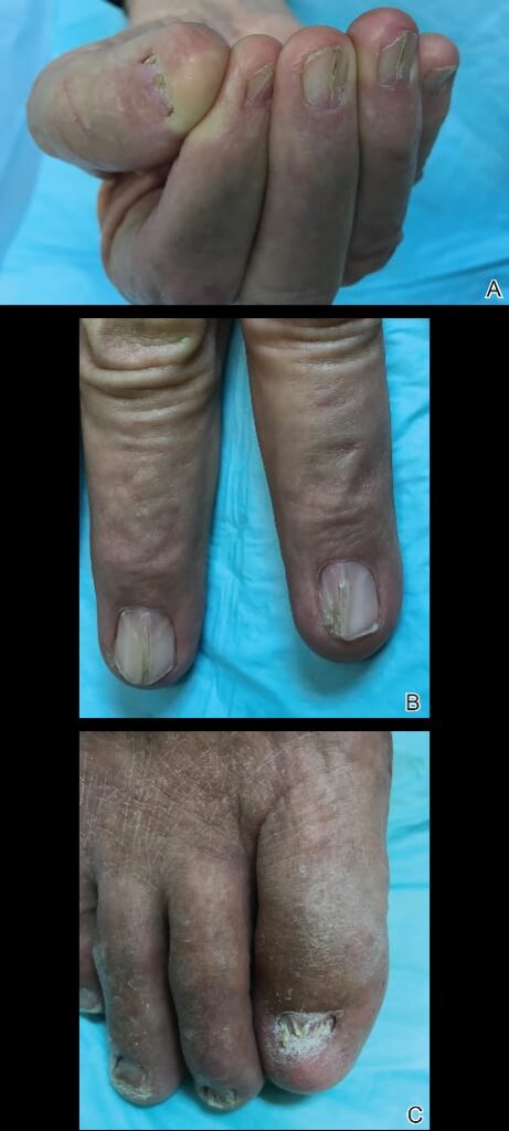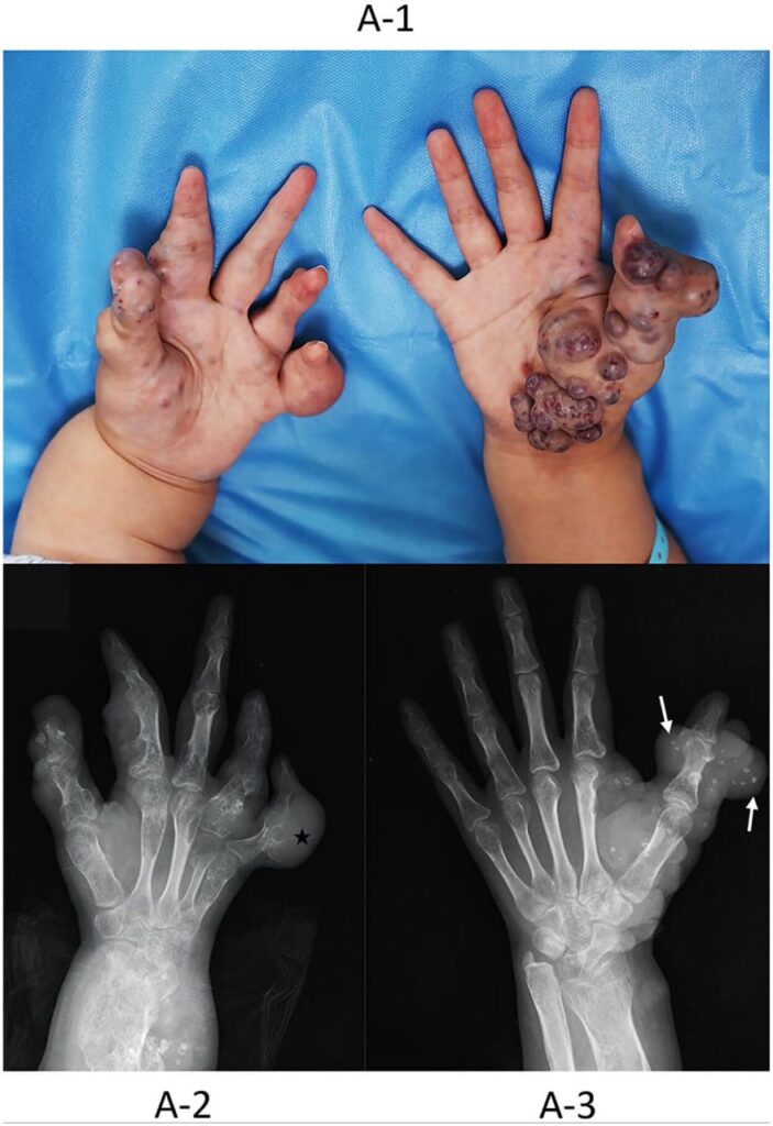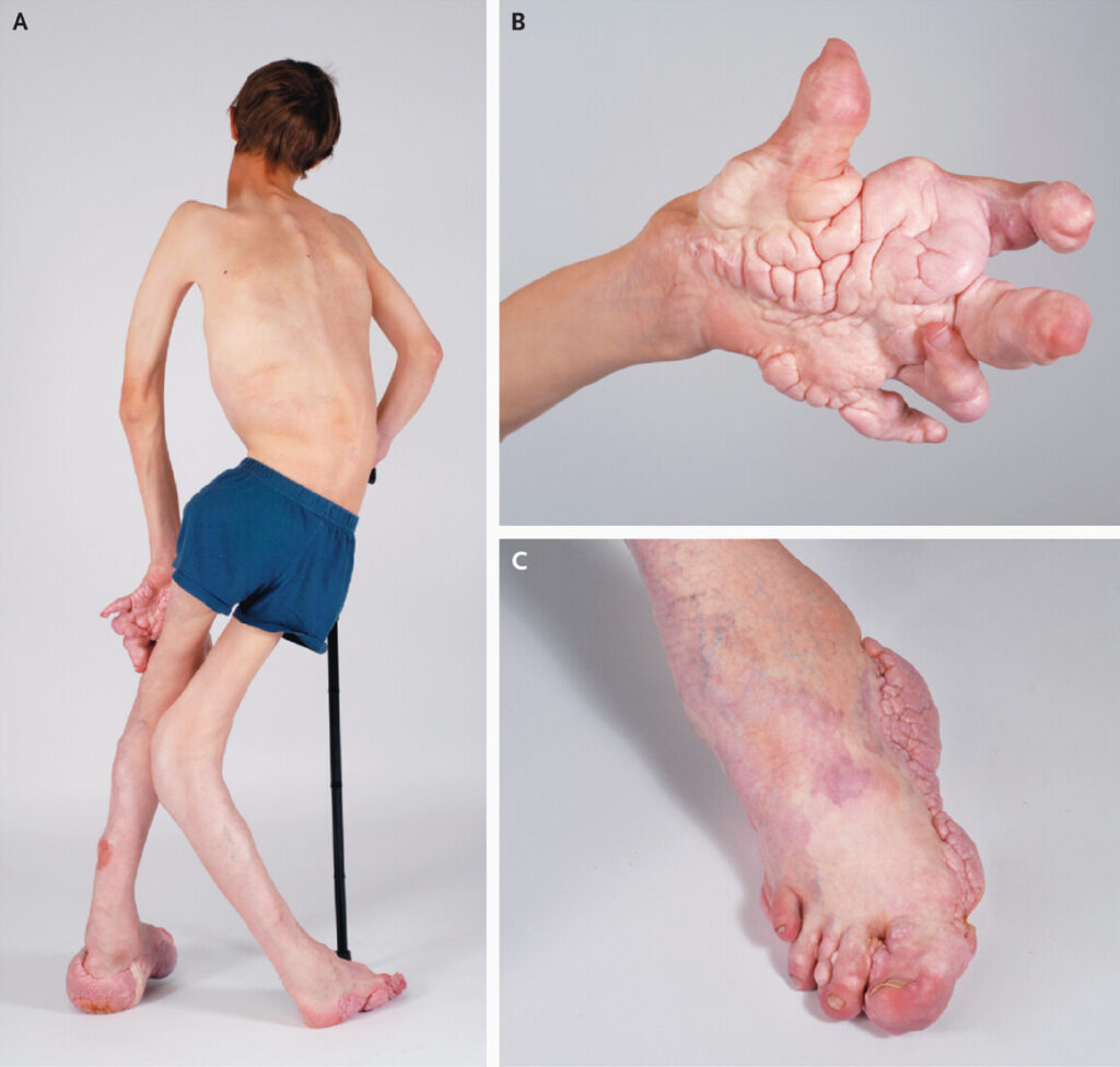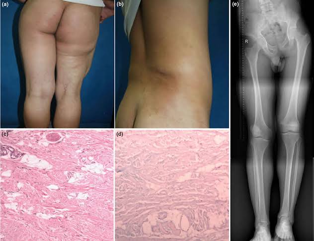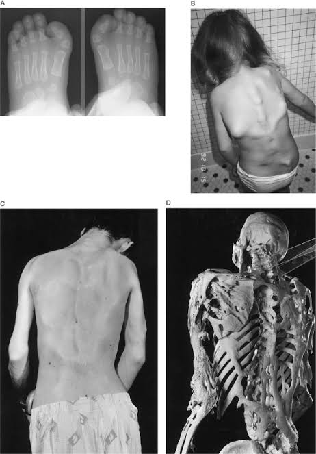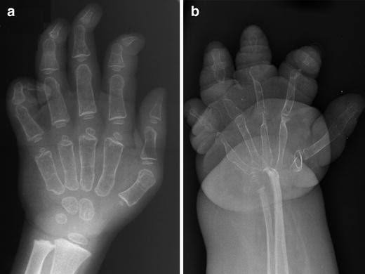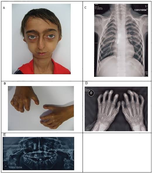 Cyst‐like lesions of the phalanges and irregular thickening of the cortex of the metatarsals and metacarpal.