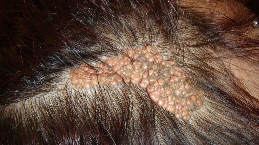 Angiofibromas: pulsed dye vascular laser (wavelength 595 nm)