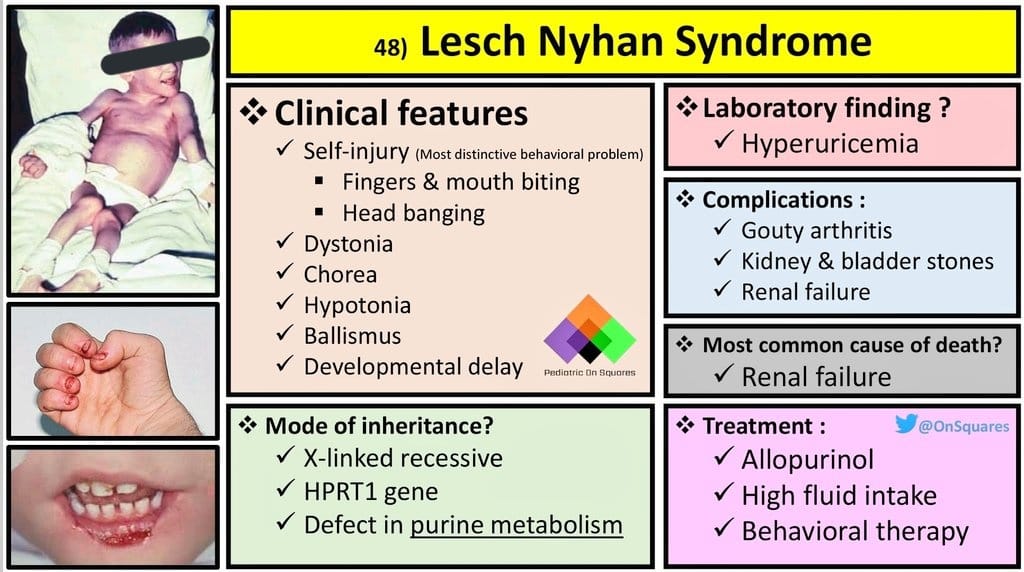 Leisch Nahyan ek pagal insaan hai, jo dance karta (chorea) , gata haklata (dysarthria), cd70 motorocycle (60-70 iq) per charh k sheher mein ghoomta hai, khud ko aur sab ko kat’ta phirta hai (self harm and aggresiveness) Urine bhi kardeta hai unpe (inc Uric acid), hairat angez (HRPT1 gene) aur khoonkhaar (in erythrocytes) admi hai